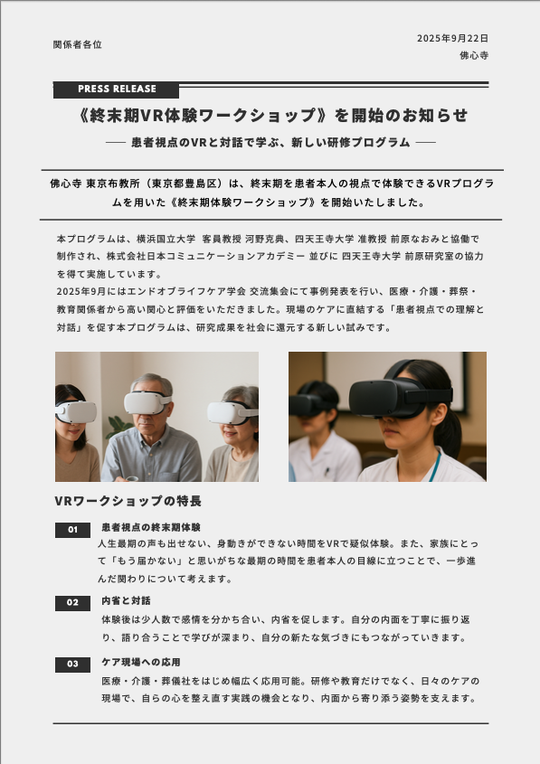 佛心寺 東京布教所(東京都豊島区)は、終末期を患者本人の視点で体験できるVRプログラムを用いた《終末期体験ワークショップ》を開始いたしました。