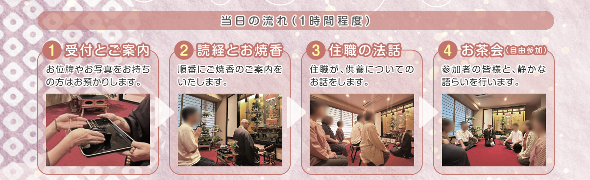 2.当日の受付  開始10分前にお越しください。お位牌・お写真をお持ちいただけます。
